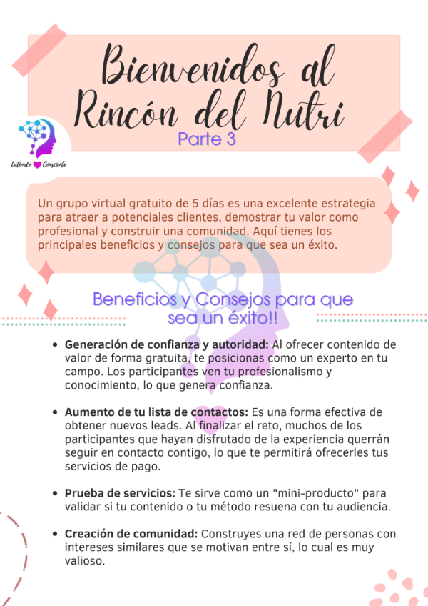 El Reto de 5 Días de "El Rincón del Nutri" es una estrategia diseñada para que los profesionales de la nutrición, como tú, atraigan clientes potenciales y construyan una comunidad sólida. Este grupo virtual gratuito te ayuda a posicionarte como un experto en tu campo, lo que genera confianza en tus conocimientos y profesionalismo.